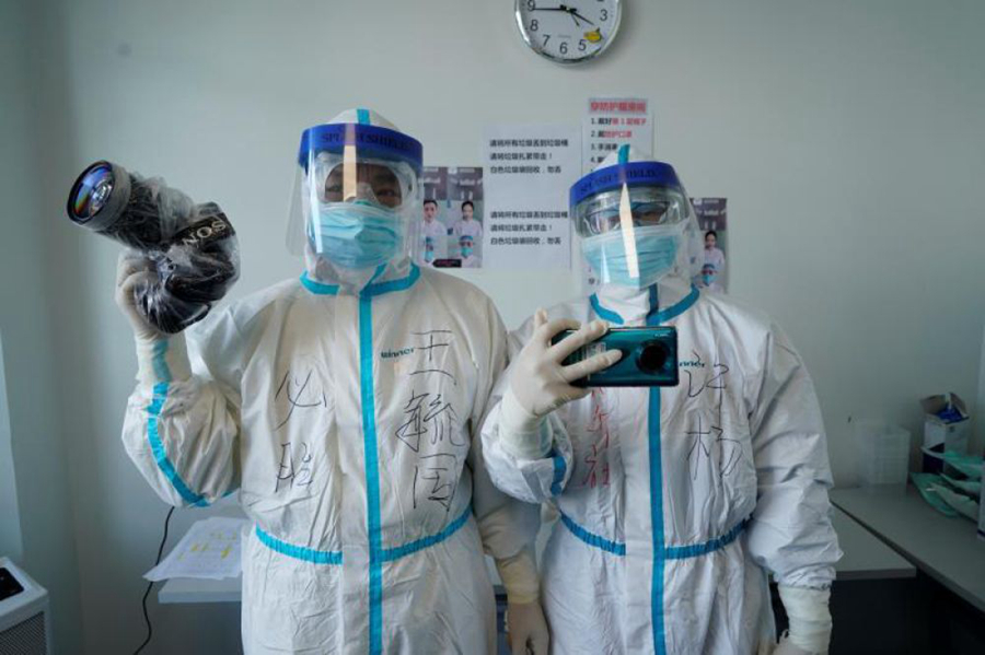 2月18日,新華社記者王毓國(guó)(左)、許楊在華中科技大學(xué)同濟(jì)醫(yī)院中法新城院區(qū)準(zhǔn)備進(jìn)入隔離病房?jī)?nèi)采訪。新華社記者 余國(guó)慶 攝
