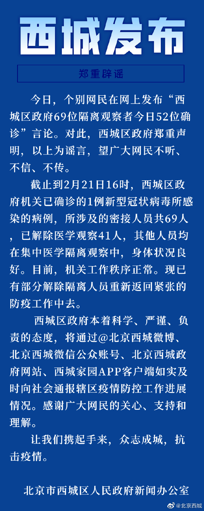 【鄭重辟謠:西城區(qū)政府69位隔離觀察者今日52位確診系謠言】望廣大網(wǎng)民不聽、不信、不傳,讓我們攜起手來(lái),眾志成城,抗擊疫情。
