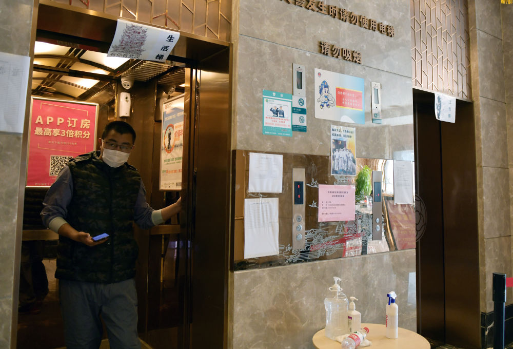 在武漢同濟(jì)醫(yī)院光谷院區(qū),醫(yī)護(hù)人員下班后在乘坐電梯時(shí)所有人都朝向不同方向,期間不說(shuō)話,減少交叉感染風(fēng)險(xiǎn)。