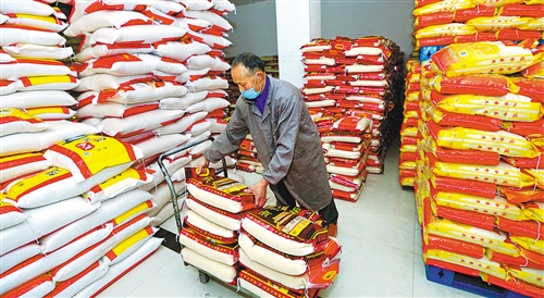 2月18日,四川建國順發(fā)商貿有限公司工人在搬卸大米。連日來,該公司每天加班加點為各大超市供應大米。鐘 敏攝(中經視覺)