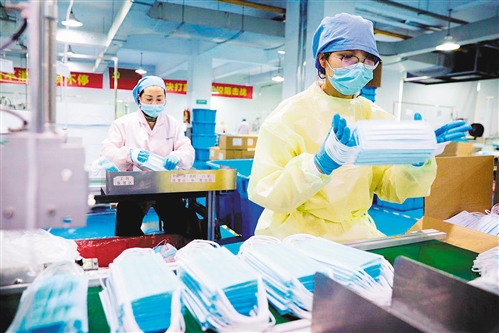 2月14日,浙江省長(zhǎng)興縣和平鎮(zhèn)長(zhǎng)興美迪康無(wú)紡布制品有限公司員工加緊生產(chǎn)口罩。 許 旭攝(中經(jīng)視覺(jué))