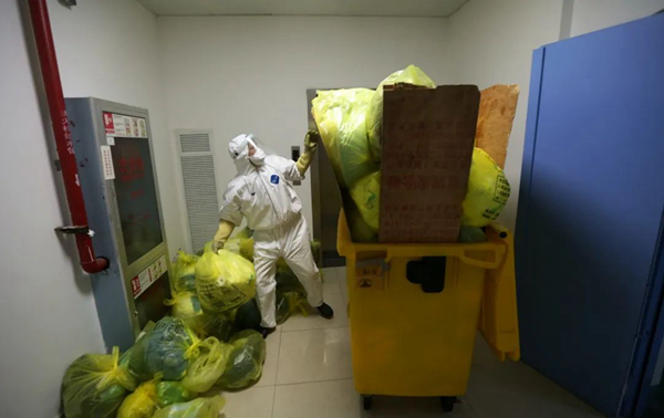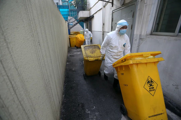 但是醫(yī)療廢棄物產(chǎn)生的速度實在太快,一線醫(yī)務工作者用完的防護服、口罩、鞋套……病人的生活垃圾,病人的餐余垃圾,病人的嘔吐物等等感染性廢棄物都要快速處理,醫(yī)療廢棄物產(chǎn)生的速度已超過了后勤部門正常的處理速度。周師傅介紹稱,ICU中的保潔員會將感染性醫(yī)療廢棄物集中放在指定處理間的黃色垃圾桶中,然后他們有四位師傅每天早上六點到下午五點會在整個院區(qū)不停地轉(zhuǎn)運黃色垃圾桶,然后還會安排專人值班,晚上只要接到院內(nèi)科室電話就會趕過去把黃色垃圾桶運出來,他們已經(jīng)保證24小時隨時有人在崗負責處理醫(yī)療廢棄物了,“我們不拼命不行啊,這是人命關(guān)天的事?!敝軒煾捣Q。