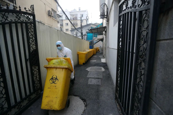 同濟中法新城醫(yī)院的醫(yī)療廢棄物原本放在醫(yī)院地下室的暫存間,使用紅外線和藥水進行消毒,但是隨著新冠肺炎疫情的到來,產(chǎn)生的醫(yī)療廢棄物是以前的近十倍,而且都是感染性的醫(yī)療廢棄物?!耙郧拔覀兊尼t(yī)療廢棄物放在垃圾桶里都會把垃圾桶蓋子蓋上,但是現(xiàn)在醫(yī)療廢棄物實在太多了,不僅蓋子蓋不上,我們還要把垃圾硬塞進垃圾箱,有時候裝有醫(yī)療廢棄物的垃圾袋受擠壓會突然炸開,嚴重威脅我們醫(yī)療廢物處理人員的安全,但是為了盡快收完垃圾,確保院區(qū)所有人的安全,我們只能不惜一切代價了。” 另一位負責醫(yī)療廢棄物的處理工作的周師傅稱。