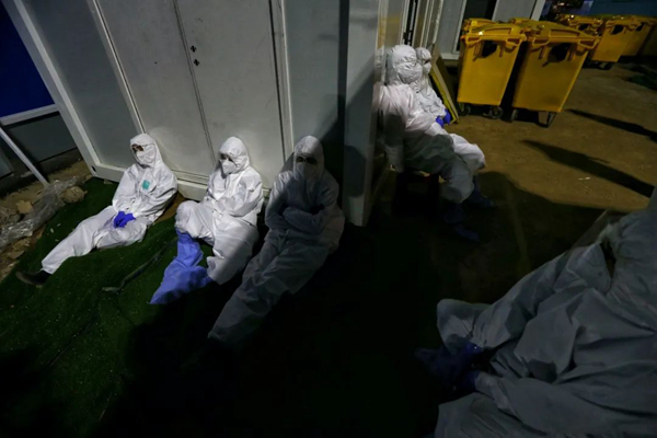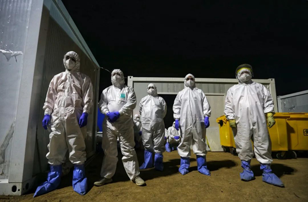 雷神山醫(yī)院負責處置清運醫(yī)療廢物的志愿者們(攝影:崔萌)