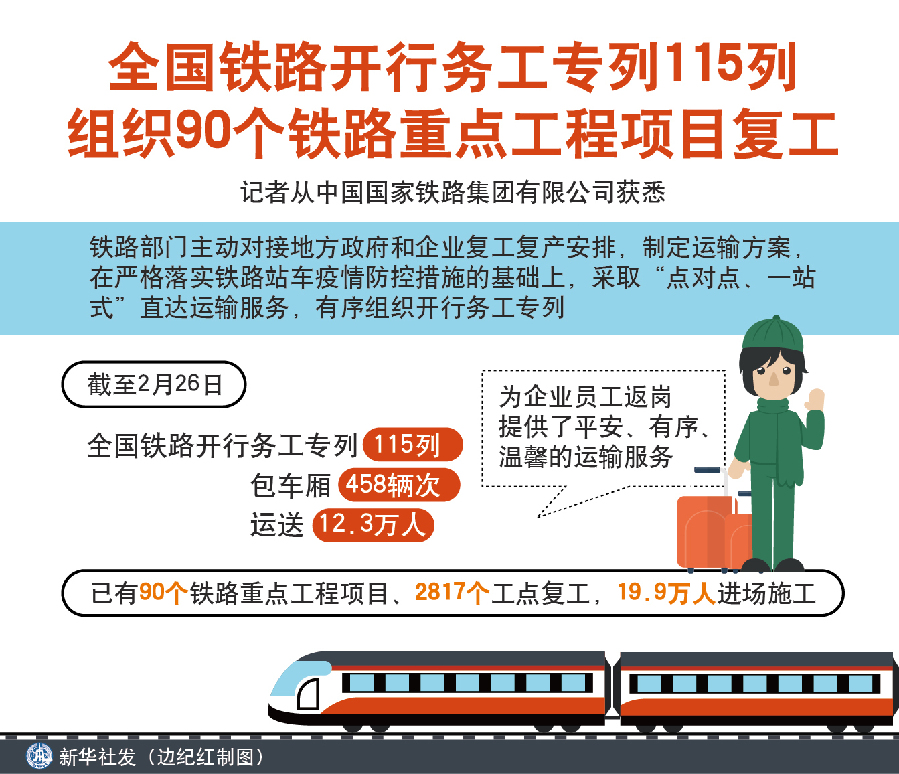 圖表:全國鐵路開行務(wù)工專列115列 組織90個鐵路重點工程項目復(fù)工 新華社發(fā) 邊紀紅 制圖