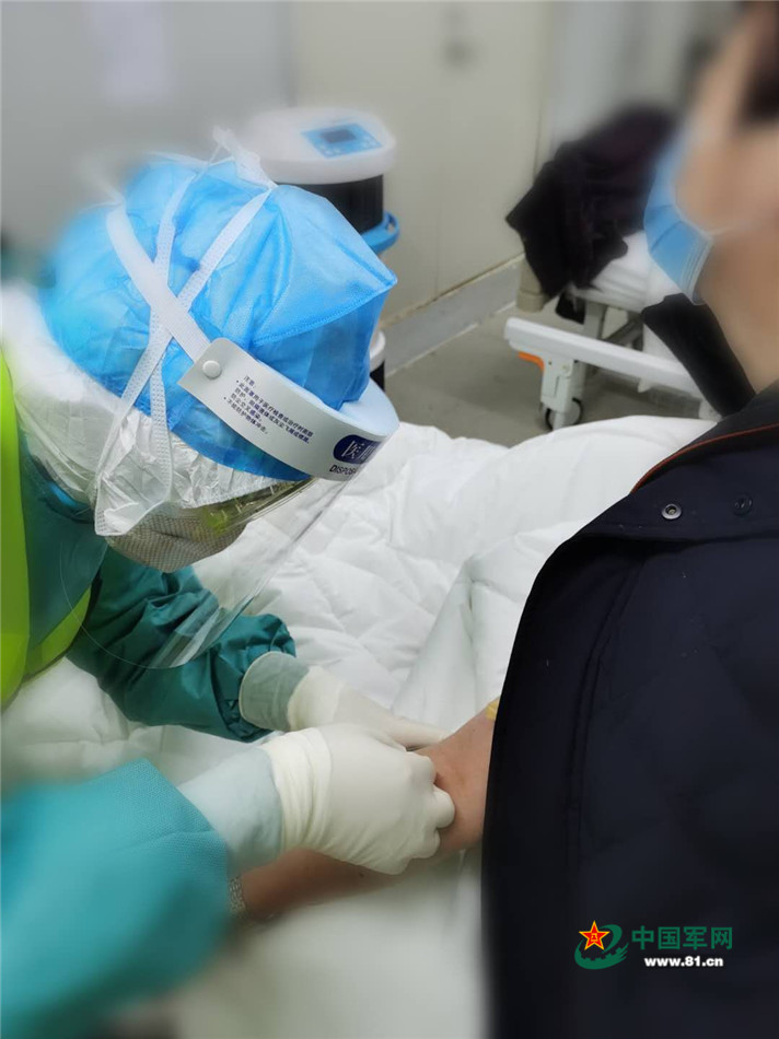 今天的主要任務(wù)是給18名病人抽血。這項(xiàng)平時(shí)對(duì)我來說簡單的不能再簡單的任務(wù),此刻卻充滿了挑戰(zhàn)性??谡?、帽子、手套、防護(hù)服、護(hù)目鏡、防護(hù)面屏都給抽血帶來了極大的困難,呼出的熱氣讓護(hù)目鏡變得模糊,昏暗的燈光讓本就有限的視線變得更加不足,三層防護(hù)手套讓抽血也變得毫無手感。在抽血過程中,一個(gè)大媽問道:“姑娘,你們是來自部隊(duì)的么?”我看著她那親切的眼神,笑著點(diǎn)了點(diǎn)頭。大媽露出了信任的微笑,“有你們?cè)?,我就放心了?!边@句話讓我的內(nèi)心久久不能平靜。