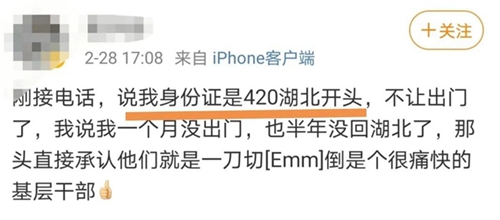 春節(jié)期間曾被輿論一致抨擊的“排鄂”現(xiàn)象,近期在有些地方死灰復(fù)燃,甚至有“加碼”跡象:多位湖北籍網(wǎng)民發(fā)帖稱,自己過去幾個月沒回過老家,但因為“身份證是42開頭”,社區(qū)、基層干部就以“大數(shù)據(jù)報告”為依據(jù),要求強制集中隔離;有長租企業(yè)突然通知湖北籍租客,密碼鎖已被凍結(jié);還有企業(yè)大量解雇湖北籍員工……