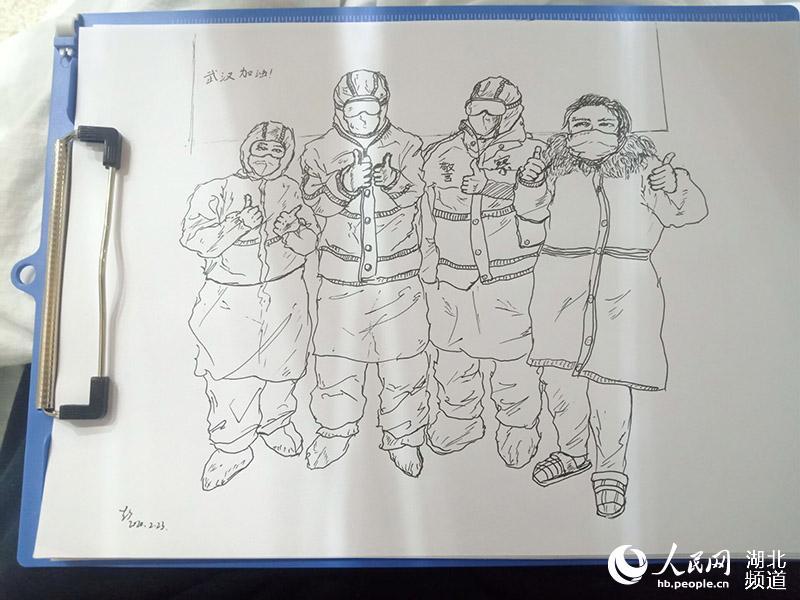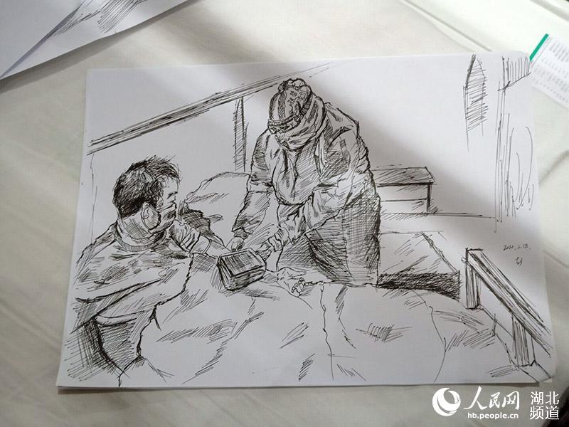 “被照顧得很好”的小彭常??吹结t(yī)護人員們穿著厚重的防護服,一忙就是6個小時以上不停歇,連水和飯都得換班以后吃,卻每天依然為患者提供無微不至的照顧。出于感動和感激,彭昕燁向醫(yī)護人員借了紙和筆,將方艙醫(yī)院溫暖的瞬間畫成素描。