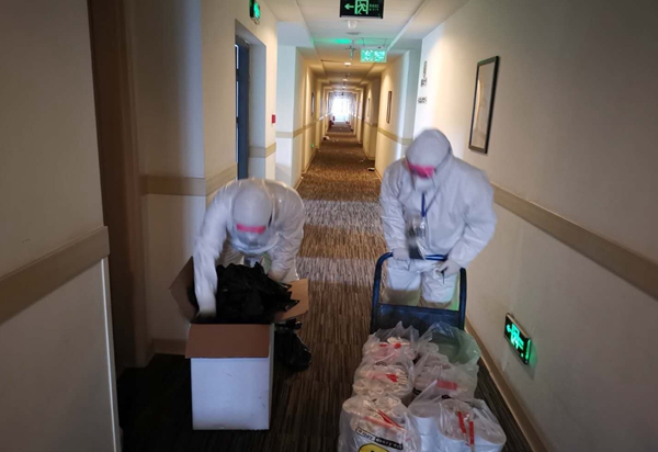 走馬嶺“康復驛站”負責人、走馬嶺街工委副書記陶勇介紹,目前整個東西湖區(qū)共有5家“康復驛站”。由于走馬嶺“康復驛站”此前作為兩次檢測轉陰患者的“待出院隔離觀察點”,所以酒店已經按照“三區(qū)兩通道”要求進行了改造。昨天入住的出院患者來自各個醫(yī)院,包括火神山醫(yī)院、東西湖區(qū)人民醫(yī)院、兒童醫(yī)院以及各個方艙醫(yī)院,由區(qū)里和街道調配車輛完成轉運。陶勇說:“因為這里最開始作為‘雙陰’的一個待出院隔離點,所以就按照‘三區(qū)兩通道’的格局來制定。一個是病人的通道,另一個是醫(yī)生的通道,病人走了以后,我們進行殺毒、登記,然后安排到酒店的房間。我們旁邊也征用了一個別人的公司,在上面打通了一個連接酒店那邊的通道?!?/p>