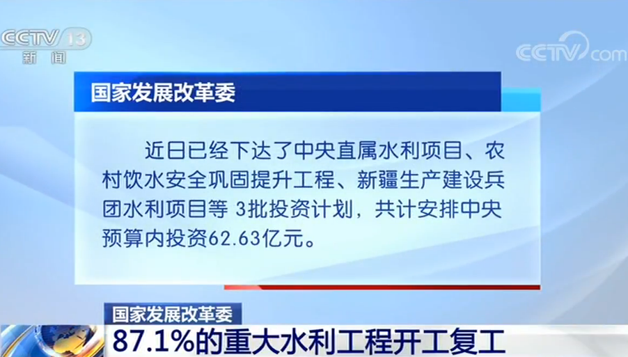 國家發(fā)展改革委近日已經(jīng)下達(dá)了中央直屬水利項目、農(nóng)村飲水安全鞏固提升工程、新疆生產(chǎn)建設(shè)兵團(tuán)水利項目等3批投資計劃,共計安排中央預(yù)算內(nèi)投資62.63億元。
