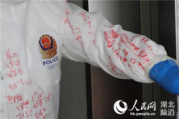 “1901張師傅的酒精、降壓藥奧美沙”“1501劉姐的電池、奶粉”“2204周師傅的甲硝唑”……遠遠望去,這件防護服胸口處張貼的警徽、背部張貼的“荊州公安”格外醒目。走近一看,袖子、腿上寫滿了字,粗粗淺淺、歪歪扭扭、大小不一。字里行間,全是群眾所需購買的物資。