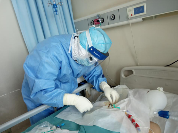 李立斌在過(guò)去25年的重癥病房工作中,更多的是在普通防護(hù)狀態(tài)下操作。而現(xiàn)在,厚重的防護(hù)服和正壓頭套給手術(shù)增加了難度。憑著過(guò)硬的技術(shù)和醫(yī)護(hù)團(tuán)隊(duì)的高效配合,他利索地完成了兩名患者的氣管插管,再一次將懸崖邊的生命拉了回來(lái)。