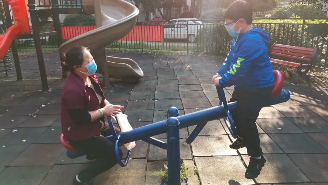 雖然開心,但是居民的防疫措施可一點(diǎn)都沒有松懈,帶著孩子出來玩兒蹺蹺板的媽媽還隨身攜帶了酒精噴霧做消殺。