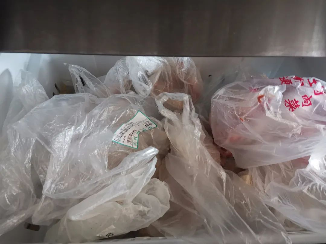 獨(dú)居老人任德康的冰箱里滿滿的肉和菜