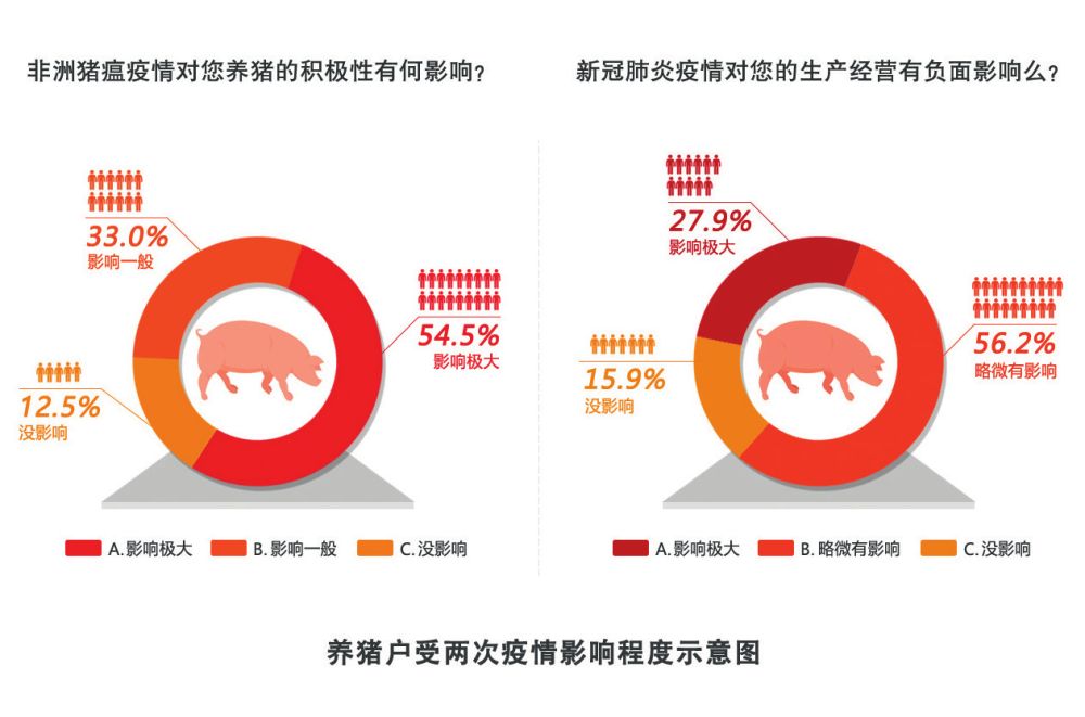 調(diào)查顯示,54.5%的養(yǎng)豬戶認(rèn)為非洲豬瘟疫情對(duì)養(yǎng)豬的積極性影響極大,防護(hù)成本高、造成虧損、仔豬成本高,是養(yǎng)豬戶反映非洲豬瘟疫情帶來的最強(qiáng)烈影響,27.9%的養(yǎng)豬戶認(rèn)為新冠肺炎疫情對(duì)生產(chǎn)經(jīng)營(yíng)的負(fù)面影響極大。(見圖1)