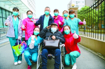 昨天上午,武漢協(xié)和醫(yī)院西院北京醫(yī)療隊負責的病區(qū)內(nèi),一名91歲的老兵孫爺爺康復出院,與平日里照料自己的醫(yī)護人員合影時,老兵敬了一個軍禮。記者 和冠欣攝