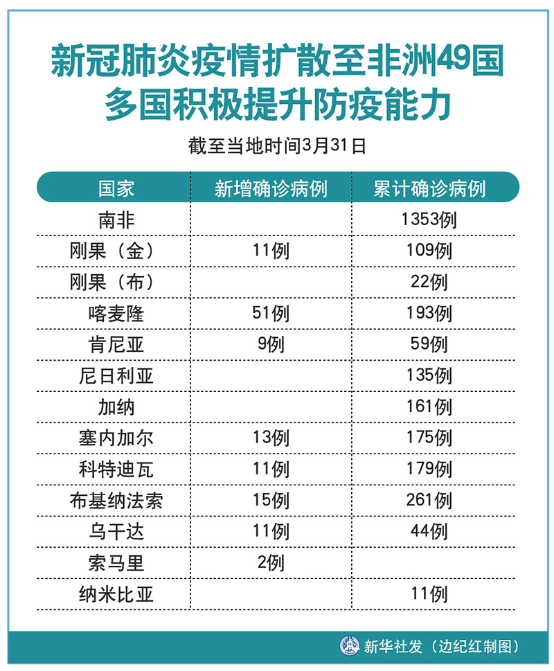 3月31日,塞拉利昂和布隆迪分別首次報(bào)告了新冠肺炎確診病例;坦桑尼亞、博茨瓦納、塞內(nèi)加爾和剛果(布)均報(bào)告了首例新冠肺炎死亡病例;剛果(金)確診病例過百。