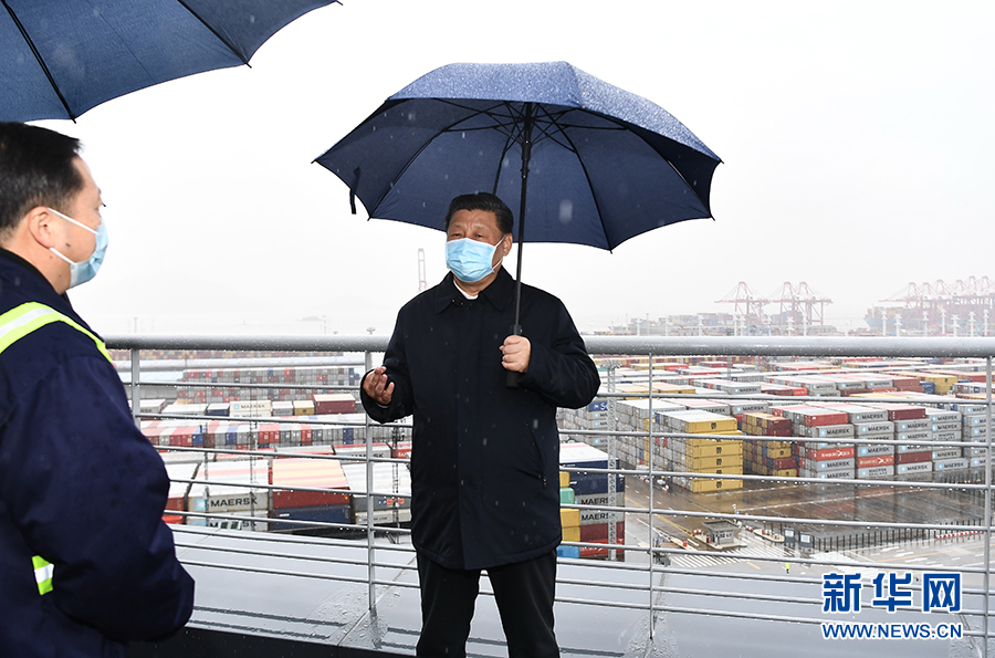 3月29日,中共中央總書記、國家主席、中央軍委主席習近平在浙江考察調(diào)研。這是習近平在寧波舟山港穿山港區(qū)碼頭了解港口復工復產(chǎn)情況。 新華社記者 申宏 攝