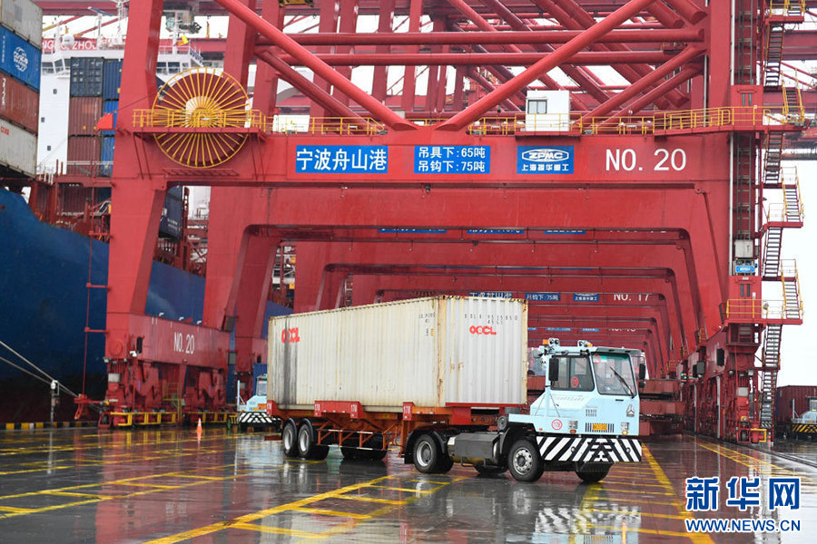 在寧波舟山港梅山島國際集裝箱碼頭,裝有集裝箱的卡車從橋吊下駛出(2019年12月19日攝)。新華社記者 黃宗治 攝