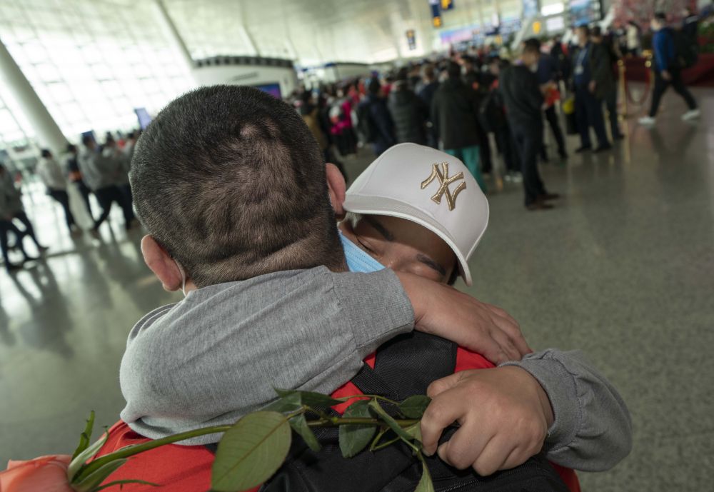 ↑3月19日,在武漢天河機(jī)場(chǎng),河南醫(yī)療隊(duì)隊(duì)員郭燕姿緊緊抱住丈夫王國(guó)曉。 夫妻二人都來(lái)自河南新鄉(xiāng),王國(guó)曉是醫(yī)生,郭燕姿是護(hù)士長(zhǎng)。2月9日,夫妻倆馳援武漢,隨后,郭燕姿被分配到青山方艙醫(yī)院工作,而王國(guó)曉則被分配到了另外一個(gè)區(qū)。從那以后,夫妻倆已有一個(gè)多月沒有見面。3月19日當(dāng)天,夫妻倆在機(jī)場(chǎng)重逢。