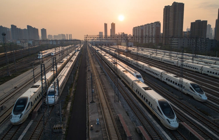 在武漢動(dòng)車段,列車4月8日??吭诖孳嚲€上準(zhǔn)備投入運(yùn)行(無人機(jī)照片)。新華社記者肖藝九攝