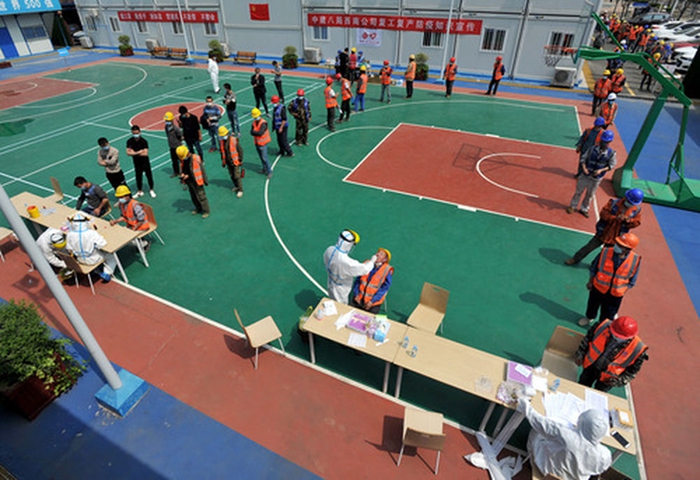 在中建八局武漢中央文化區(qū)萬達(dá)項(xiàng)目部,返崗員工4月7日在接受核酸和抗體指標(biāo)檢測(cè)。 新華社發(fā)(史偉 攝)