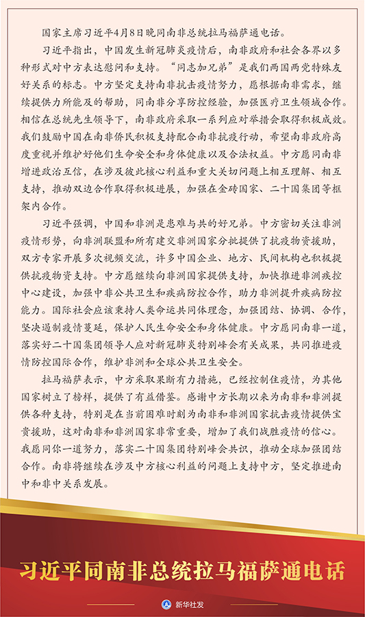 拉馬福薩表示,中方采取果斷有力措施,已經(jīng)控制住疫情,為其他國家樹立了榜樣,提供了有益借鑒。感謝中方長期以來為南非和非洲提供各種支持,特別是在當前困難時刻為南非和非洲國家抗擊疫情提供寶貴援助,這對南非和非洲國家非常重要,增加了我們戰(zhàn)勝疫情的信心。我愿同你一道努力,落實二十國集團特別峰會共識,推動全球加強團結合作。南非將繼續(xù)在涉及中方核心利益的問題上支持中方,堅定推進南中和非中關系發(fā)展。