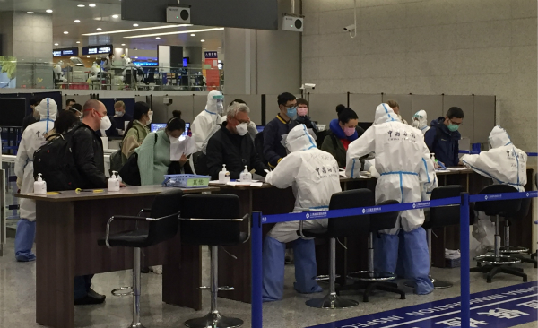 海關(guān)關(guān)員在上海浦東國際機場對入境旅客進行流行病學(xué)調(diào)查。新華社發(fā)(吳宇 攝)