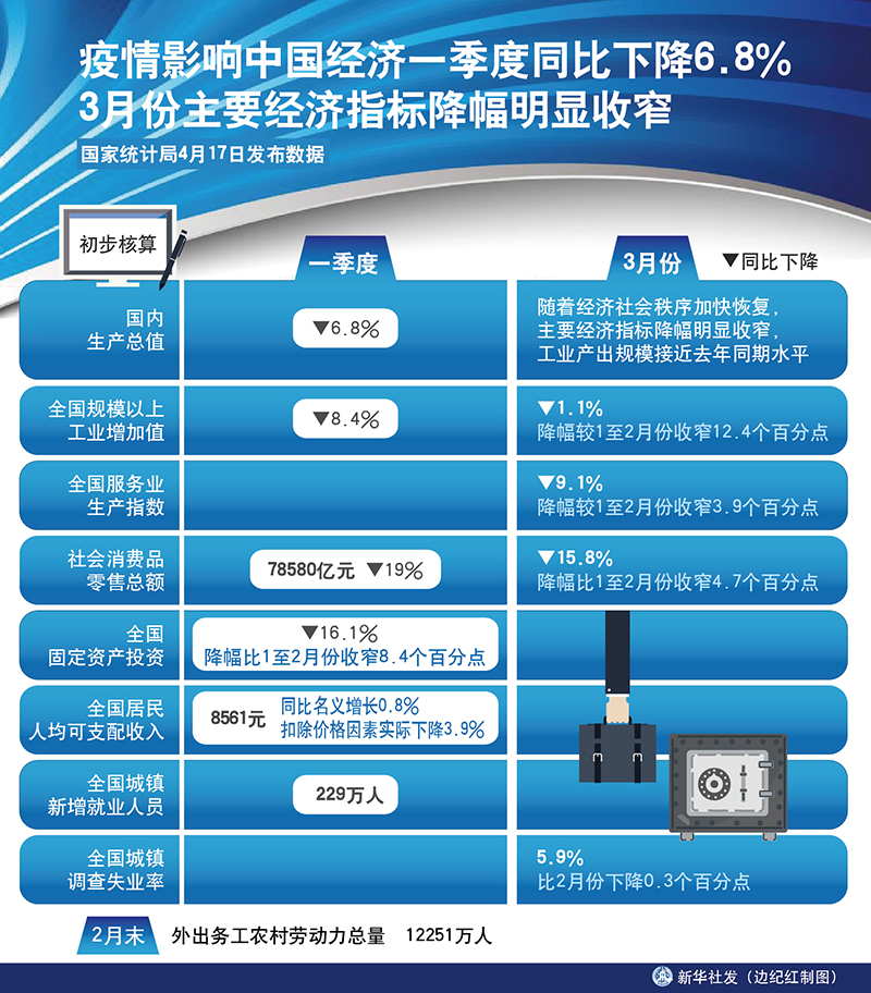 疫情影響中國經(jīng)濟一季度同比下降6.8% 3月份主要經(jīng)濟指標(biāo)降幅明顯收窄-新華網(wǎng)