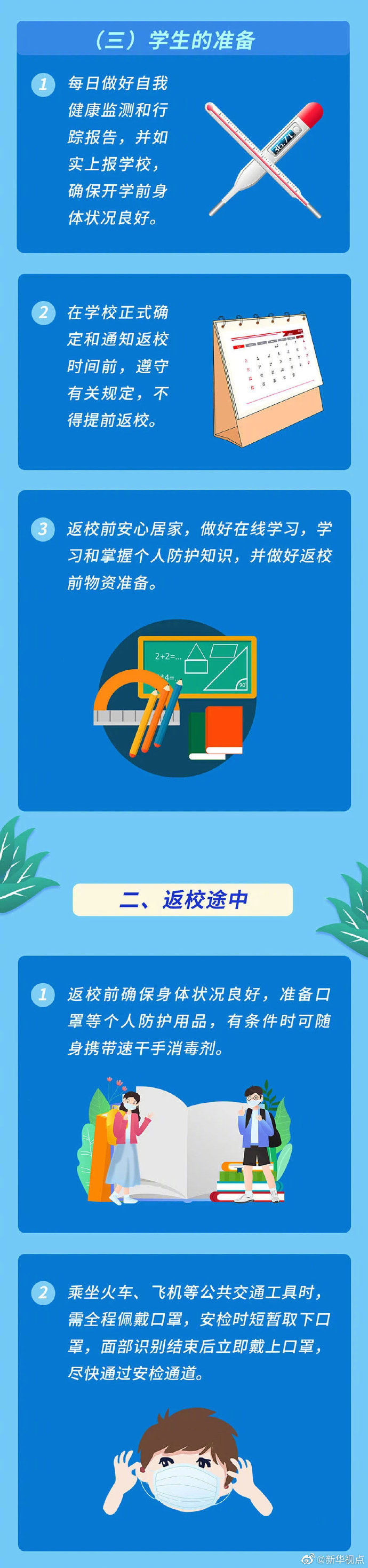 返校途中如何正確防護?開學后上課、用餐又該注意啥?周末還能出校改善伙食嗎?國家衛(wèi)健委、教育部日前聯合印發(fā)《大專院校新冠肺炎疫情防控技術方案》,馬上開學的你,快收下這份防控寶典↓(圖片來源:健康中國)(記者溫競華) ?????