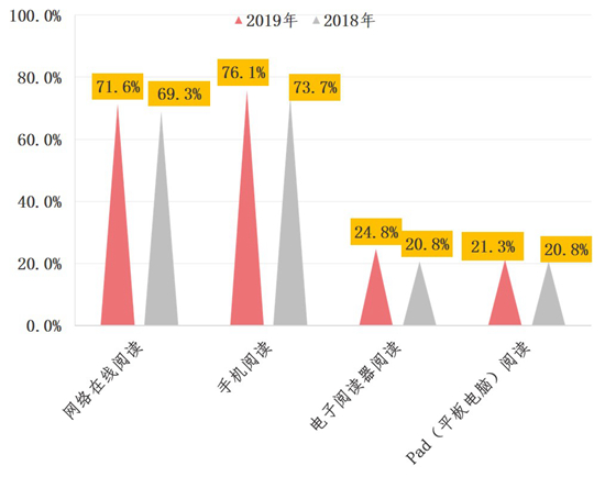 具體來看,2019年有76.1%的成年國民進行過手機閱讀,71.6%的成年國民進行過網絡在線閱讀,24.8%的成年國民在電子閱讀器上閱讀,21.3%的成年國民使用Pad(平板電腦)進行數(shù)字化閱讀,均較2018年有所上升。