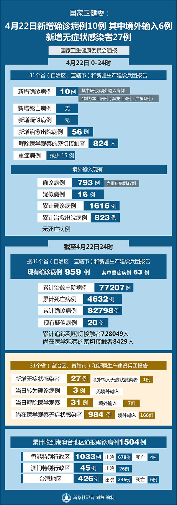 截至4月22日24時,據(jù)31個?。ㄗ灾螀^(qū)、直轄市)和新疆生產(chǎn)建設(shè)兵團(tuán)報告,現(xiàn)有確診病例959例(其中重癥病例63例),累計治愈出院病例77207例,累計死亡病例4632例,累計報告確診病例82798例,現(xiàn)有疑似病例20例。累計追蹤到密切接觸者728049人,尚在醫(yī)學(xué)觀察的密切接觸者8429人。
