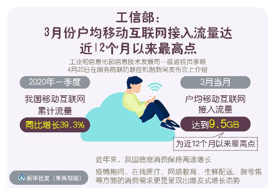 新華社北京4月25日電(記者王希、董瑞豐)今年一季度,我國(guó)移動(dòng)互聯(lián)網(wǎng)累計(jì)流量同比增長(zhǎng)39.3%,3月當(dāng)月戶均移動(dòng)互聯(lián)網(wǎng)接入流量達(dá)到9.5GB,為近12個(gè)月以來(lái)最高點(diǎn)。
