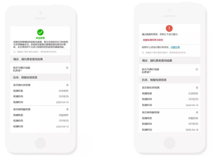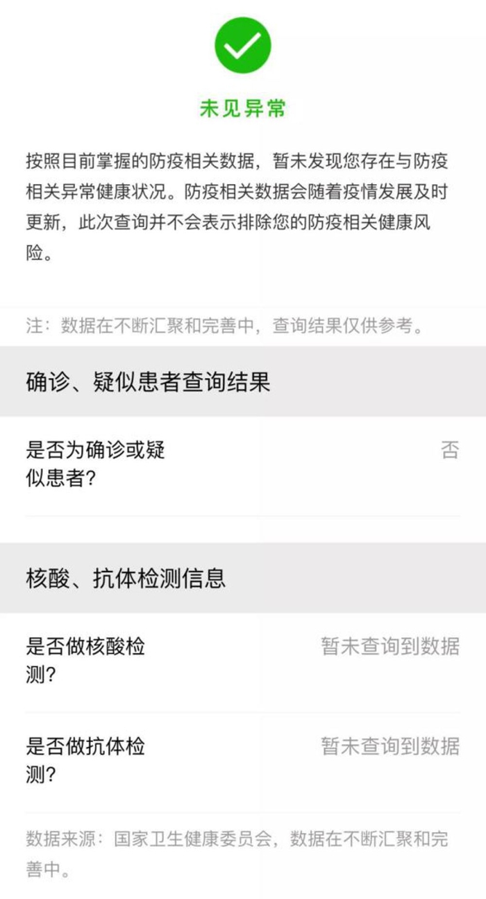 此外,核酸和抗體檢測結果信息還納入了全國一體化平臺“防疫健康信息碼”服務。用戶可通過國家政務服務平臺微信、支付寶、百度小程序,根據(jù)操作指引申領國家平臺的“防疫健康信息碼”,“防疫健康信息碼”會如實反映本人7天內(nèi)核酸及抗體檢測結果。如核酸檢測結果為陰性,則防疫健康風險狀態(tài)顯示“未見異?!?。如核酸檢測結果為陽性,則會出現(xiàn)“核酸檢測結果為陽性”的出行提示。如果7天內(nèi)未做過核酸及抗體檢測,防疫健康信息會根據(jù)個人當前提供的相關數(shù)據(jù)顯示健康風險結果。