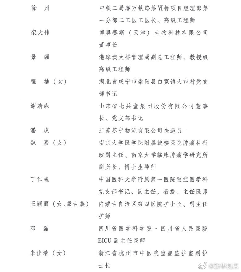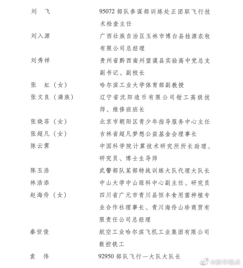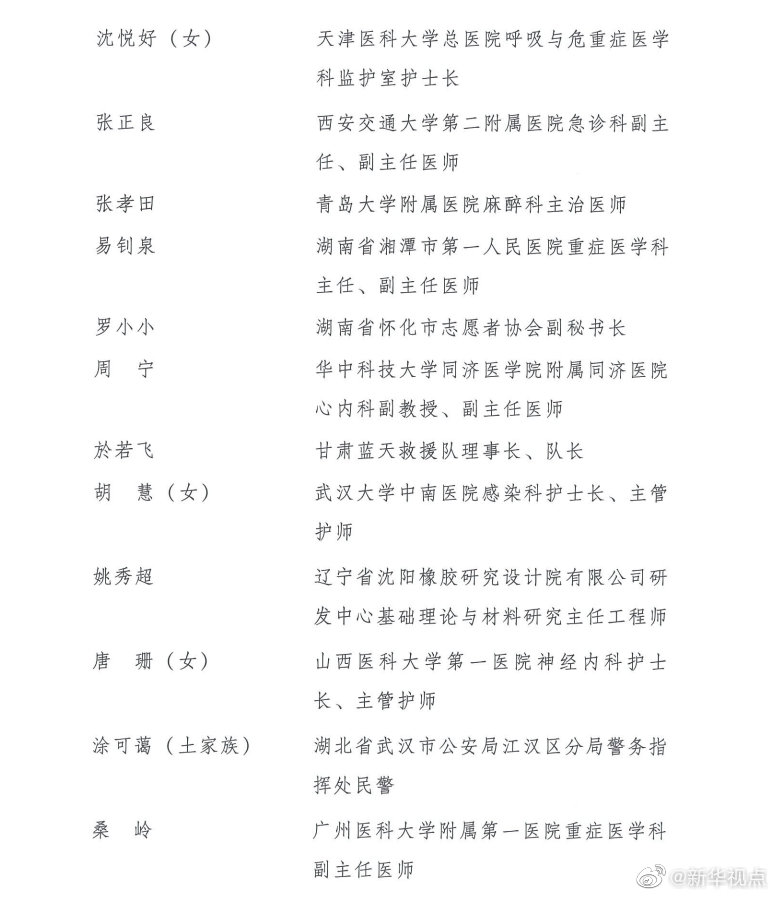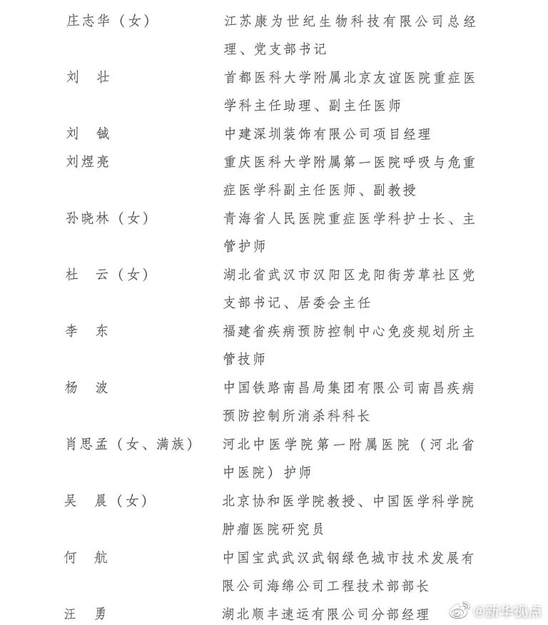 榮獲第24屆“中國(guó)青年五四獎(jiǎng)?wù)隆钡姆謩e是:江蘇省南京市鼓樓區(qū)方家營(yíng)消防救援站站長(zhǎng)助理、三級(jí)消防長(zhǎng)丁良浩,安徽省滁州市定遠(yuǎn)縣吳圩鎮(zhèn)西孔村黨總支第一書記王萌萌(女),廈門大學(xué)航空航天學(xué)院常務(wù)副院長(zhǎng)、特聘教授、博士生導(dǎo)師尤延鋮,湖北省黃岡市羅田縣希望小學(xué)校長(zhǎng)方榮(女),浙江每日互動(dòng)網(wǎng)絡(luò)科技股份有限公司董事長(zhǎng)兼總經(jīng)理、黨委書記方毅,浙江省杭州市拱墅區(qū)職業(yè)高級(jí)中學(xué)美發(fā)專業(yè)教師石丹(女),國(guó)家超級(jí)計(jì)算無(wú)錫中心副主任付昊桓,中國(guó)石油大港油田公司第二采油廠作業(yè)二區(qū)注采二組副組長(zhǎng)馮萌萌(女),寧夏回族自治區(qū)石嘴山市中醫(yī)醫(yī)院副主任醫(yī)師朱斌,中國(guó)國(guó)家女子排球隊(duì)隊(duì)員、隊(duì)長(zhǎng)朱婷(女),95072部隊(duì)參謀部訓(xùn)練處正團(tuán)職飛行技術(shù)檢查主任劉飛,廣西壯族自治區(qū)玉林市博白縣桂源農(nóng)牧有限公司總經(jīng)理劉入源,貴州省黔西南州望謨縣實(shí)驗(yàn)高中黨總支副書記、副校長(zhǎng)劉秀祥,哈爾濱工業(yè)大學(xué)體育部副教授張虹(女),遼寧省沈陽(yáng)造幣有限公司鉗工高級(jí)技師、維修班班長(zhǎng)張文良(滿族),北京市朝陽(yáng)區(qū)青少年指導(dǎo)服務(wù)中心主任張曉菲(女),吉林省超凡夢(mèng)想公益基金會(huì)理事長(zhǎng)張超凡(女),中國(guó)科學(xué)院計(jì)算技術(shù)研究所所長(zhǎng)助理、研究員、博士生導(dǎo)師陳云霽,武警部隊(duì)某部特戰(zhàn)訓(xùn)練大隊(duì)代理大隊(duì)長(zhǎng)陳玉浩,中山大學(xué)中山眼科中心副主任、研究員林浩添,四川省廣元市青川縣恒豐食用菌種植專業(yè)合作社理事長(zhǎng)、青川海伶山珍商貿(mào)有限責(zé)任公司總經(jīng)理趙海伶(女),航空工業(yè)哈爾濱飛機(jī)工業(yè)集團(tuán)有限公司數(shù)控銑工秦世俊,92950部隊(duì)飛行一大隊(duì)大隊(duì)長(zhǎng)袁偉,中鐵二局磨萬(wàn)鐵路第Ⅵ標(biāo)項(xiàng)目經(jīng)理部第一分部二工區(qū)工區(qū)長(zhǎng)、高級(jí)工程師徐州,博奧賽斯(天津)生物科技有限公司董事長(zhǎng)欒大偉,港珠澳大橋管理局副總工程師、教授級(jí)高級(jí)工程師景強(qiáng),湖北省咸寧市崇陽(yáng)縣白霓鎮(zhèn)大市村黨支部書記程桔(女),山東省七兵堂集團(tuán)股份有限公司董事長(zhǎng)、黨支部書記謝清森,江蘇蘇寧物流有限公司快遞員潘虎,南京大學(xué)醫(yī)學(xué)院附屬鼓樓醫(yī)院腫瘤科行政副主任、南京大學(xué)臨床腫瘤學(xué)研究所副所長(zhǎng)、博士生導(dǎo)師魏嘉(女),中國(guó)醫(yī)科大學(xué)附屬第一醫(yī)院重癥醫(yī)學(xué)科黨支部書記、副主任,教授、主任醫(yī)師丁仁彧,內(nèi)蒙古自治區(qū)第四醫(yī)院護(hù)士長(zhǎng)、副主任護(hù)師王穎麗(女、蒙古族),四川省醫(yī)學(xué)科學(xué)院·四川省人民醫(yī)院EICU副主任醫(yī)師鄧?yán)冢憬『贾菔兄嗅t(yī)院重癥監(jiān)護(hù)室副護(hù)士長(zhǎng)朱佳清(女),江蘇康為世紀(jì)生物科技有限公司總經(jīng)理、黨支部書記莊志華(女),首都醫(yī)科大學(xué)附屬北京友誼醫(yī)院重癥醫(yī)學(xué)科主任助理、副主任醫(yī)師劉壯,中建深圳裝飾有限公司項(xiàng)目經(jīng)理劉鋮,重慶醫(yī)科大學(xué)附屬第一醫(yī)院呼吸與危重癥醫(yī)學(xué)科副主任醫(yī)師、副教授劉煜亮,青海省人民醫(yī)院重癥醫(yī)學(xué)科護(hù)士長(zhǎng)、主管護(hù)師孫曉林(女),湖北省武漢市漢陽(yáng)區(qū)龍陽(yáng)街芳草社區(qū)黨支部書記、居委會(huì)主任杜云(女),福建省疾病預(yù)防控制中心免疫規(guī)劃所主管技師李東,中國(guó)鐵路南昌局集團(tuán)有限公司南昌疾病預(yù)防控制所消殺科科長(zhǎng)楊波,河北中醫(yī)學(xué)院第一附屬醫(yī)院(河北省中醫(yī)院)護(hù)師肖思孟(女、滿族),北京協(xié)和醫(yī)學(xué)院教授、中國(guó)醫(yī)學(xué)科學(xué)院腫瘤醫(yī)院研究員吳晨(女),中國(guó)寶武武漢武鋼綠色城市技術(shù)發(fā)展有限公司海綿公司工程技術(shù)部部長(zhǎng)何航,湖北順豐速運(yùn)有限公司分部經(jīng)理汪勇,天津醫(yī)科大學(xué)總醫(yī)院呼吸與危重癥醫(yī)學(xué)科監(jiān)護(hù)室護(hù)士長(zhǎng)沈悅好(女),西安交通大學(xué)第二附屬醫(yī)院急診科副主任、副主任醫(yī)師張正良,青島大學(xué)附屬醫(yī)院麻醉科主治醫(yī)師張孝田,湖南省湘潭市第一人民醫(yī)院重癥醫(yī)學(xué)科主任、副主任醫(yī)師易釗泉,湖南省懷化市志愿者協(xié)會(huì)副秘書長(zhǎng)羅小小,華中科技大學(xué)同濟(jì)醫(yī)學(xué)院附屬同濟(jì)醫(yī)院心內(nèi)科副教授、副主任醫(yī)師周寧,甘肅藍(lán)天救援隊(duì)理事長(zhǎng)、隊(duì)長(zhǎng)於若飛,武漢大學(xué)中南醫(yī)院感染科護(hù)士長(zhǎng)、主管護(hù)師胡慧(女),遼寧省沈陽(yáng)橡膠研究設(shè)計(jì)院有限公司研發(fā)中心基礎(chǔ)理論與材料研究主任工程師姚秀超,山西醫(yī)科大學(xué)第一醫(yī)院神經(jīng)內(nèi)科護(hù)士長(zhǎng)、主管護(hù)師唐珊(女),湖北省武漢市公安局江漢區(qū)分局警務(wù)指揮處民警涂可藹(土家族),廣州醫(y