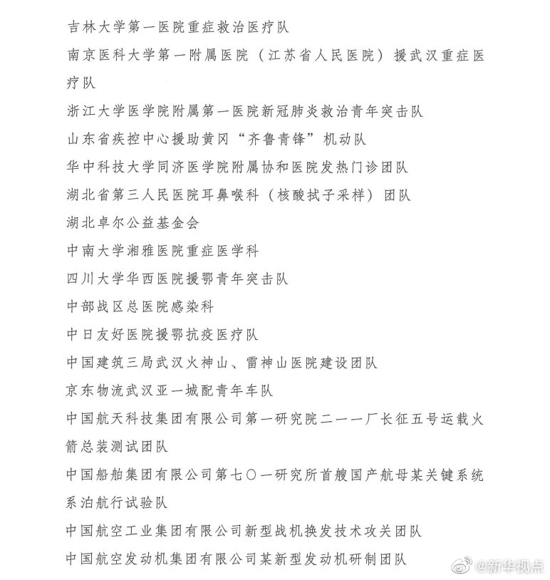 榮獲“中國(guó)青年五四獎(jiǎng)?wù)录w”的分別是:北汽福田國(guó)慶70周年群眾游行彩車底盤制作和技術(shù)保障團(tuán)隊(duì),天津飛騰嵌入式CPU研發(fā)團(tuán)隊(duì),河北醫(yī)科大學(xué)第一醫(yī)院“先心病”愛(ài)心團(tuán)隊(duì),太鋼集團(tuán)不銹鋼“手撕鋼”創(chuàng)新研發(fā)團(tuán)隊(duì),哈爾濱工業(yè)大學(xué)紫丁香學(xué)生微納衛(wèi)星團(tuán)隊(duì),諸暨市公安局楓橋派出所,科大訊飛認(rèn)知智能國(guó)家重點(diǎn)實(shí)驗(yàn)室創(chuàng)新團(tuán)隊(duì),南昌大學(xué)“稻漁工程”團(tuán)隊(duì),濰柴青年科技創(chuàng)新團(tuán)隊(duì),中國(guó)散裂中子源建設(shè)團(tuán)隊(duì),中國(guó)航發(fā)渦輪院某發(fā)動(dòng)機(jī)研制團(tuán)隊(duì),甘肅省無(wú)償捐獻(xiàn)遺體器官志愿服務(wù)隊(duì),清華大學(xué)研究生支教團(tuán)青海湟中分隊(duì),73022部隊(duì)56分隊(duì),新一代精打體系武器系統(tǒng)青年創(chuàng)新團(tuán)隊(duì),北京大學(xué)援鄂抗疫醫(yī)療隊(duì),中國(guó)醫(yī)科大學(xué)新冠肺炎疫情防控醫(yī)療總隊(duì),吉林大學(xué)第一醫(yī)院重癥救治醫(yī)療隊(duì),南京醫(yī)科大學(xué)第一附屬醫(yī)院(江蘇省人民醫(yī)院)援武漢重癥醫(yī)療隊(duì),浙江大學(xué)醫(yī)學(xué)院附屬第一醫(yī)院新冠肺炎救治青年突擊隊(duì),山東省疾控中心援助黃岡“齊魯青鋒”機(jī)動(dòng)隊(duì),華中科技大學(xué)同濟(jì)醫(yī)學(xué)院附屬協(xié)和醫(yī)院發(fā)熱門診團(tuán)隊(duì),湖北省第三人民醫(yī)院耳鼻喉科(核酸拭子采樣)團(tuán)隊(duì),湖北卓爾公益基金會(huì),中南大學(xué)湘雅醫(yī)院重癥醫(yī)學(xué)科,四川大學(xué)華西醫(yī)院援鄂青年突擊隊(duì),中部戰(zhàn)區(qū)總醫(yī)院感染科,中日友好醫(yī)院援鄂抗疫醫(yī)療隊(duì),中國(guó)建筑三局武漢火神山、雷神山醫(yī)院建設(shè)團(tuán)隊(duì),京東物流武漢亞一城配青年車隊(duì),中國(guó)航天科技集團(tuán)有限公司第一研究院二一一廠長(zhǎng)征五號(hào)運(yùn)載火箭總裝測(cè)試團(tuán)隊(duì),中國(guó)船舶集團(tuán)有限公司第七〇一研究所首艘國(guó)產(chǎn)航母某關(guān)鍵系統(tǒng)系泊航行試驗(yàn)隊(duì),中國(guó)航空工業(yè)集團(tuán)有限公司新型戰(zhàn)機(jī)換發(fā)技術(shù)攻關(guān)團(tuán)隊(duì),中國(guó)航空發(fā)動(dòng)機(jī)集團(tuán)有限公司某新型發(fā)動(dòng)機(jī)研制團(tuán)隊(duì)。