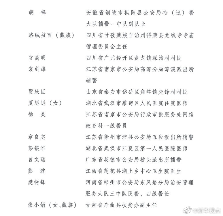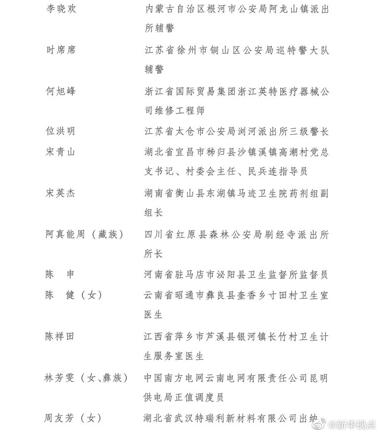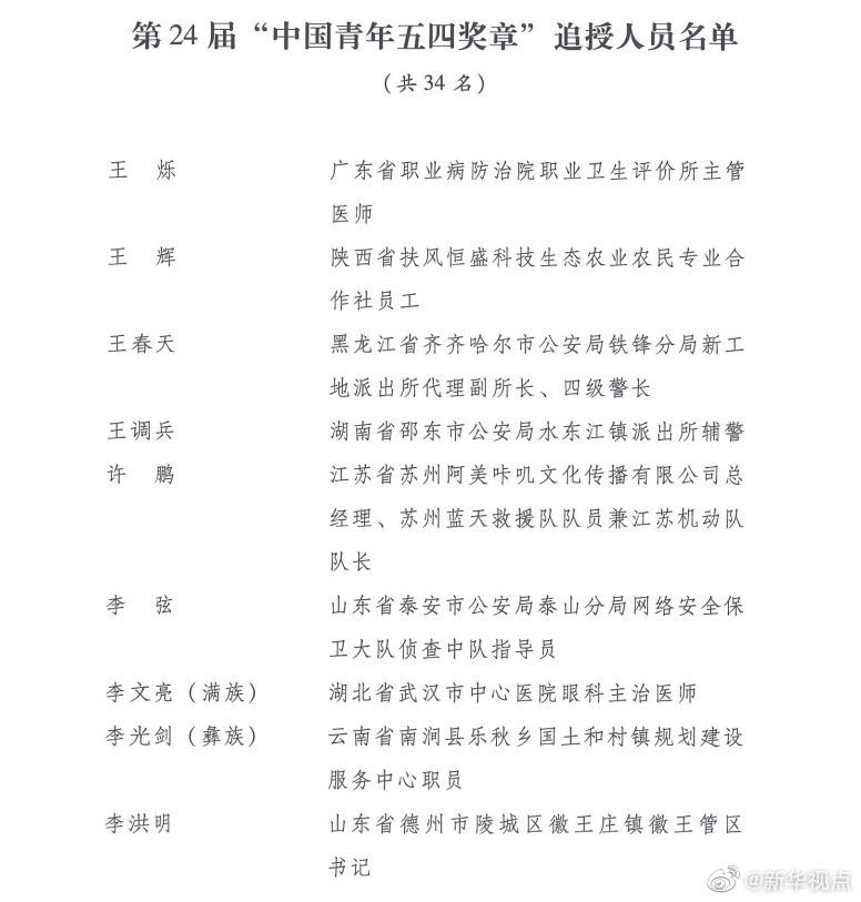 第24屆“中國(guó)青年五四獎(jiǎng)?wù)隆弊肥谌藛T分別是:廣東省職業(yè)病防治院職業(yè)衛(wèi)生評(píng)價(jià)所主管醫(yī)師王爍,陜西省扶風(fēng)恒盛科技生態(tài)農(nóng)業(yè)農(nóng)民專業(yè)合作社員工王輝,黑龍江省齊齊哈爾市公安局鐵鋒分局新工地派出所代理副所長(zhǎng)、四級(jí)警長(zhǎng)王春天,湖南省邵東市公安局水東江鎮(zhèn)派出所輔警王調(diào)兵,江蘇省蘇州阿美咔嘰文化傳播有限公司總經(jīng)理、蘇州藍(lán)天救援隊(duì)隊(duì)員兼江蘇機(jī)動(dòng)隊(duì)隊(duì)長(zhǎng)許鵬,山東省泰安市公安局泰山分局網(wǎng)絡(luò)安全保衛(wèi)大隊(duì)偵查中隊(duì)指導(dǎo)員李弦,湖北省武漢市中心醫(yī)院眼科主治醫(yī)師李文亮(滿族),云南省南澗縣樂(lè)秋鄉(xiāng)國(guó)土和村鎮(zhèn)規(guī)劃建設(shè)服務(wù)中心職員李光劍(彝族),山東省德州市陵城區(qū)徽王莊鎮(zhèn)徽王管區(qū)書記李洪明,內(nèi)蒙古自治區(qū)根河市公安局阿龍山鎮(zhèn)派出所輔警李曉歡,江蘇省徐州市銅山區(qū)公安局巡特警大隊(duì)輔警時(shí)席席,浙江省國(guó)際貿(mào)易集團(tuán)浙江英特醫(yī)療器械公司維修工程師何旭峰,江蘇省太倉(cāng)市公安局瀏河派出所三級(jí)警長(zhǎng)位洪明,湖北省宜昌市秭歸縣沙鎮(zhèn)溪鎮(zhèn)高潮村黨總支書記、村委會(huì)主任、民兵連指導(dǎo)員宋青山,湖南省衡山縣東湖鎮(zhèn)馬跡衛(wèi)生院藥劑組副組長(zhǎng)宋英杰,四川省紅原縣森林公安局刷經(jīng)寺派出所所長(zhǎng)阿真能周(藏族),河南省駐馬店市泌陽(yáng)縣衛(wèi)生監(jiān)督所監(jiān)督員陳申,云南省昭通市彝良縣奎香鄉(xiāng)寸田村衛(wèi)生室醫(yī)生陳?。ㄅ?,江西省萍鄉(xiāng)市蘆溪縣銀河鎮(zhèn)長(zhǎng)竹村衛(wèi)生計(jì)生服務(wù)室醫(yī)生陳祥田,中國(guó)南方電網(wǎng)云南電網(wǎng)有限責(zé)任公司昆明供電局正值調(diào)度員林芳雯(女、彝族),湖北省武漢特瑞利新材料有限公司出納周友芳(女),安徽省銅陵市樅陽(yáng)縣公安局特(巡)警大隊(duì)輔警一中隊(duì)副隊(duì)長(zhǎng)胡鋒,四川省甘孜藏族自治州得榮縣龍絨寺寺廟管理委員會(huì)主任洛絨益西(藏族),四川省廣元經(jīng)開區(qū)盤龍鎮(zhèn)深溝村村民宮高明,江蘇省南京市公安局高淳分局淳溪派出所輔警袁劍雄,山東省泰安市岱岳區(qū)角峪鎮(zhèn)先鋒村村民賈慶臣,湖北省武漢市蔡甸區(qū)人民醫(yī)院住院醫(yī)師夏思思(女),江蘇省南京市公安局行政審批服務(wù)處網(wǎng)絡(luò)政務(wù)科一級(jí)警員徐昊,江蘇省徐州市沛縣公安局五段派出所輔警章良志,湖北省武漢市江夏區(qū)第一人民醫(yī)院醫(yī)師彭銀華,廣東省英德市公安局橋頭派出所輔警曾文聰,江西省蓮花縣湖上鄉(xiāng)中心衛(wèi)生院醫(yī)生熊波,河南省鄭州市公安局東風(fēng)路分局治安管理服務(wù)大隊(duì)三中隊(duì)民警、四級(jí)警長(zhǎng)樊樹鋒,甘肅省舟曲縣扶貧辦副主任張小娟(女、藏族)。