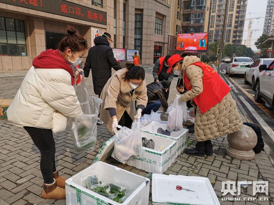 楓樺葦岸社區(qū)第一次開(kāi)展保供聯(lián)盟,劉宜和志愿者一起分裝蔬菜。(央廣網(wǎng)發(fā) 通訊員供圖)