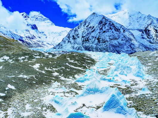 位于珠穆朗瑪峰腳下海拔5400米左右的中絨布冰川(4月30日攝,無人機(jī)照片)。普布扎西攝
