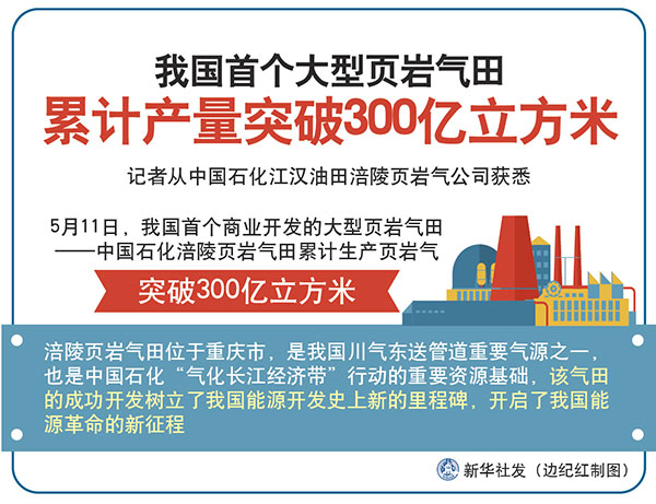 新華社重慶5月11日電(記者陶冶)記者從中國石化江漢油田涪陵頁巖氣公司獲悉,5月11日,我國首個商業(yè)開發(fā)的大型頁巖氣田——中國石化涪陵頁巖氣田累計生產(chǎn)頁巖氣突破300億立方米。