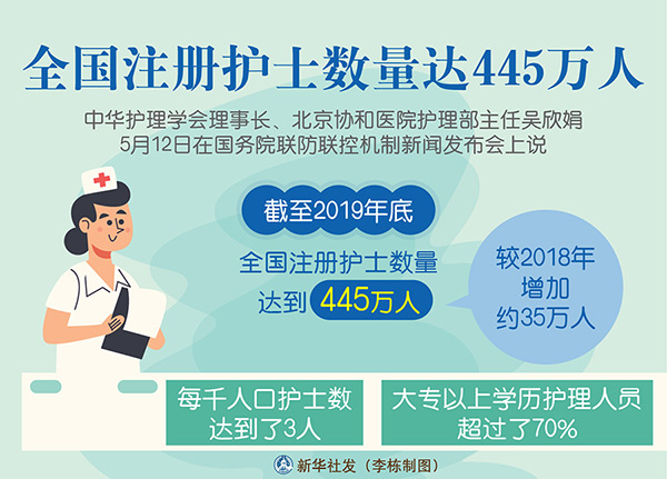 新華社北京5月12日電(記者王優(yōu)玲、王秉陽(yáng))中華護(hù)理學(xué)會(huì)理事長(zhǎng)、北京協(xié)和醫(yī)院護(hù)理部主任吳欣娟12日在國(guó)務(wù)院聯(lián)防聯(lián)控機(jī)制新聞發(fā)布會(huì)上說(shuō),截至2019年底,全國(guó)注冊(cè)護(hù)士數(shù)量達(dá)到445萬(wàn)人,較2018年增加約35萬(wàn)人。每千人口護(hù)士數(shù)達(dá)到了3人,大專(zhuān)以上學(xué)歷護(hù)理人員超過(guò)了70%。