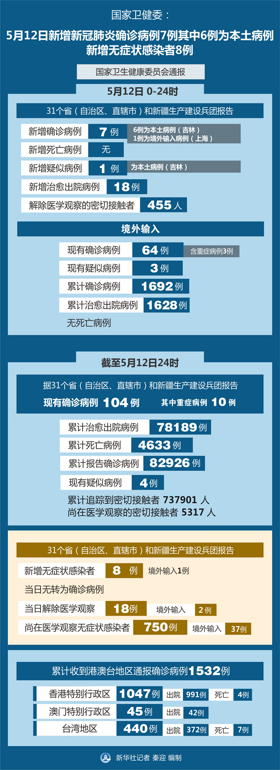 截至5月12日24時,據(jù)31個?。ㄗ灾螀^(qū)、直轄市)和新疆生產(chǎn)建設(shè)兵團報告,現(xiàn)有確診病例104例(其中重癥病例10例),累計治愈出院病例78189例,累計死亡病例4633例,累計報告確診病例82926例,現(xiàn)有疑似病例4例。累計追蹤到密切接觸者737901人,尚在醫(yī)學觀察的密切接觸者5317人。