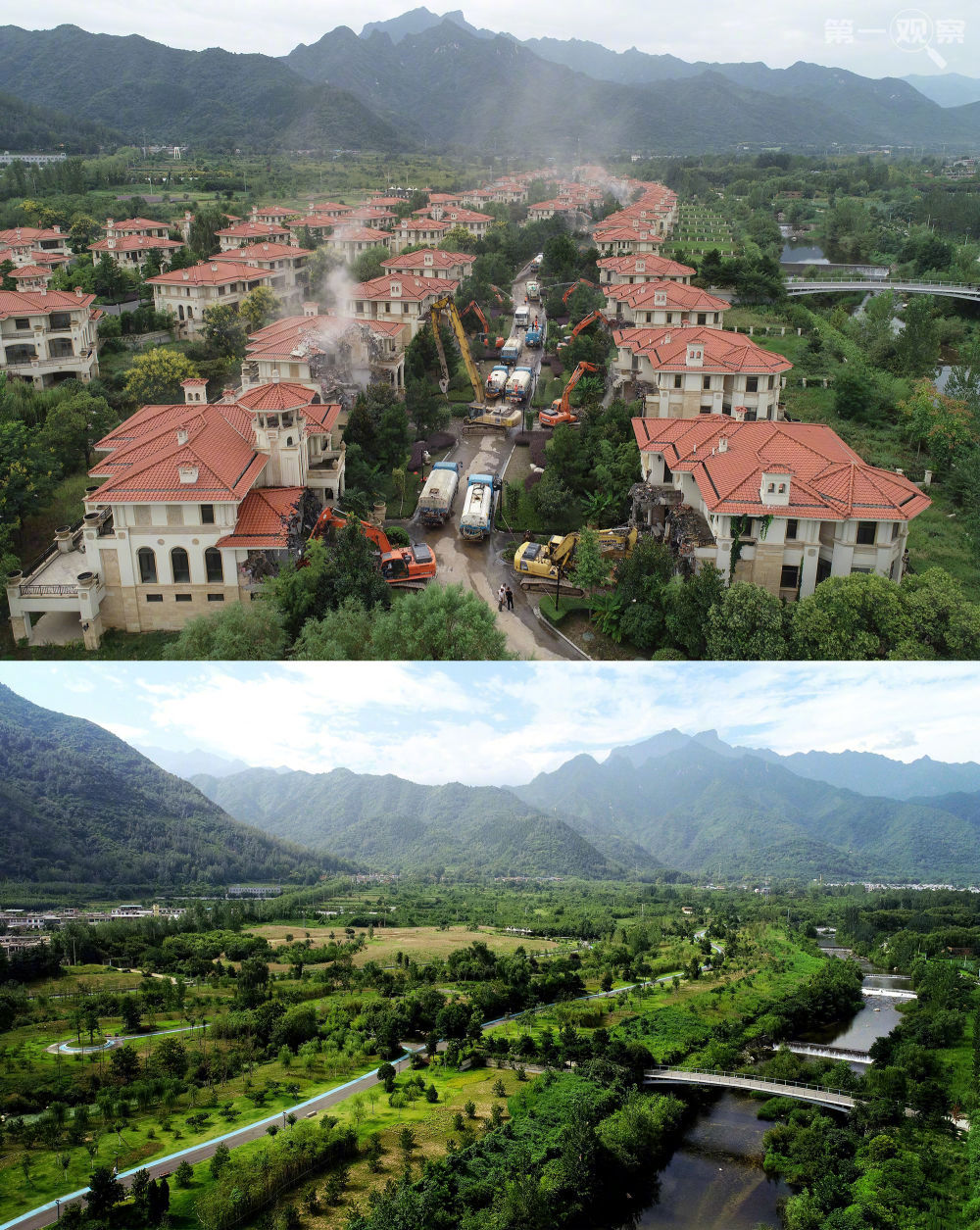 ?↑拼版照片:上圖為2018年9月,西安市長安區(qū)對轄區(qū)內(nèi)東大街道的秦嶺違建別墅“群賢別業(yè)”進行拆除(新華社記者 邵瑞 攝);下圖為2019年7月拍攝的秦嶺違建別墅“群賢別業(yè)”拆除后建設的秦嶺和諧森林公園(新華社記者 劉瀟 攝)。