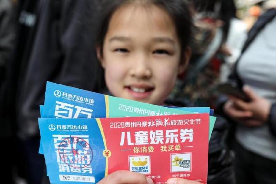 一名兒童在貴州丹寨萬達(dá)小鎮(zhèn)展示領(lǐng)取到的旅游消費(fèi)券 歐東衢 攝