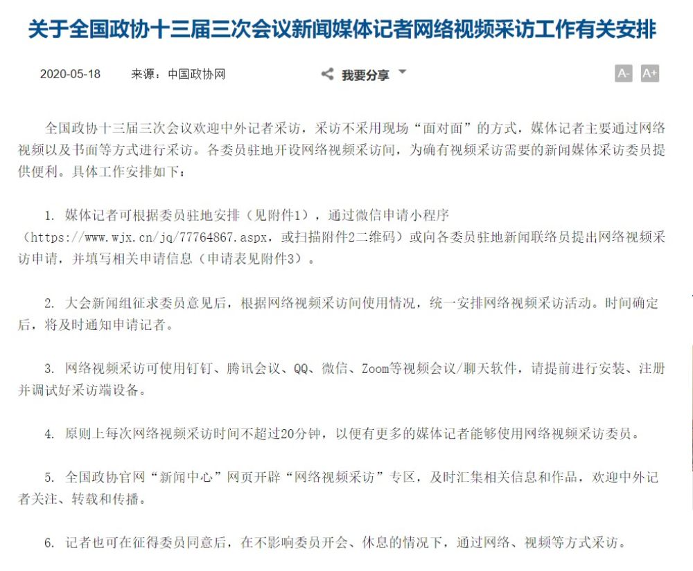 考慮到疫情防控要求和會(huì)期安排,今年全國(guó)兩會(huì)特別增添了采訪新則:“不采用‘面對(duì)面’的方式”,主要通過網(wǎng)絡(luò)視頻和書面等形式進(jìn)行采訪。