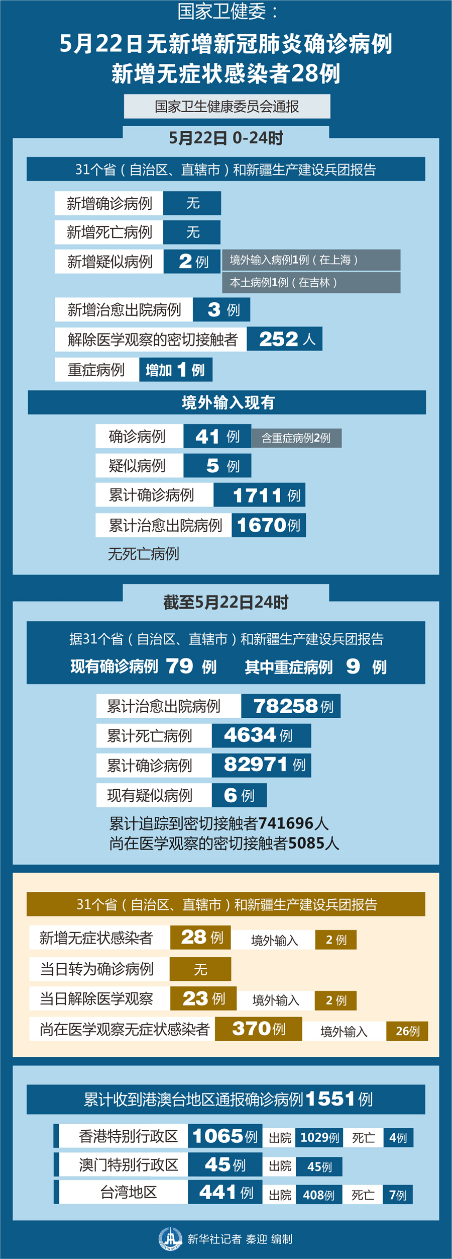 截至5月22日24時(shí),據(jù)31個(gè)?。ㄗ灾螀^(qū)、直轄市)和新疆生產(chǎn)建設(shè)兵團(tuán)報(bào)告,現(xiàn)有確診病例79例(其中重癥病例9例),累計(jì)治愈出院病例78258例,累計(jì)死亡病例4634例,累計(jì)報(bào)告確診病例82971例,現(xiàn)有疑似病例6例。累計(jì)追蹤到密切接觸者741696人,尚在醫(yī)學(xué)觀察的密切接觸者5085人。