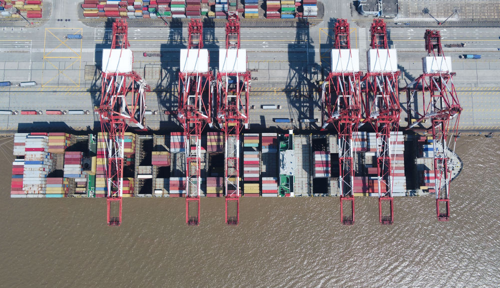 這是3月18日拍攝的上海洋山港集裝箱碼頭(無(wú)人機(jī)照片)。新華社記者 丁汀 攝