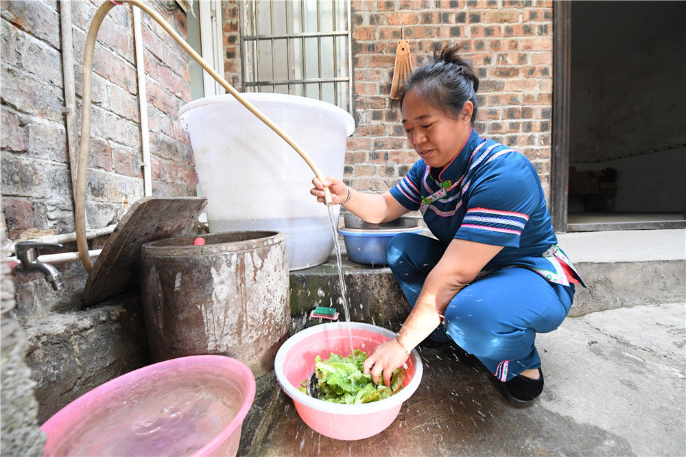 在廣西環(huán)江毛南族自治縣下南鄉(xiāng)下南社區(qū)松朗屯,覃鳳增在用自來(lái)水洗菜(5月22日攝)。新華社記者 陸波岸 攝