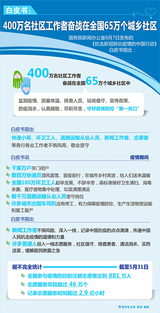 白皮書指出,新聞工作者不懼風(fēng)險、深入一線,記錄中國抗疫的點點滴滴,傳遞中國人民抗擊疫情的溫情和力量。許多普通人投入一線志愿服務(wù),社區(qū)值守、排查患者、清潔消殺、買藥送菜,緩解居民燃眉之急。據(jù)不完全統(tǒng)計,截至5月31日,全國參與疫情防控的注冊志愿者達到881萬人,志愿服務(wù)項目超過46萬個,記錄志愿服務(wù)時間超過2.9億小時。