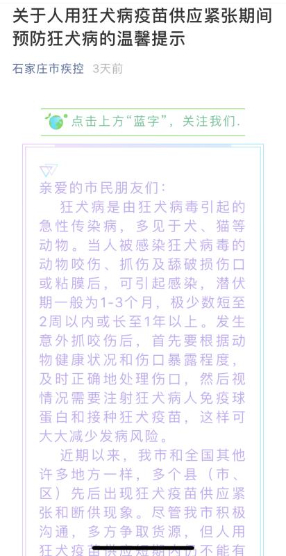 6月6日,石家莊市疾控中心發(fā)布了公告稱狂犬疫苗供應緊張。截圖